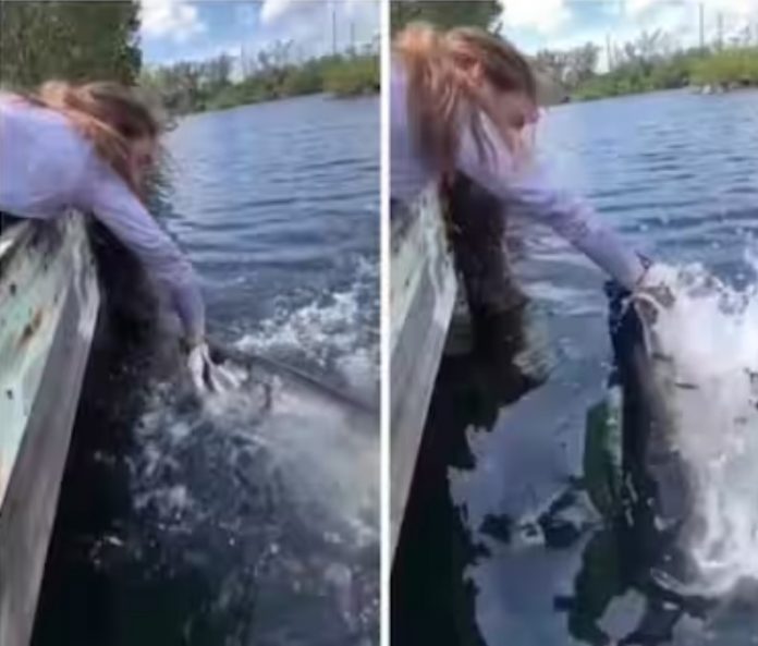 സെക്കന്റുകള്ക്കുള്ളില് ഒരു കൂറ്റന് മത്സ്യം വെള്ളത്തില് നിന്നും ഉയര്ന്ന് വന്ന് യുവതിയുടെ കൈയുടെ ഏതാണ്ട് മുട്ടോളം ഭാഗം വായ്ക്കുള്ളിലാക്കുന്നു. ഏതാണ്ട് നാല് നാലര അടിയോളം നീളമുള്ള വലിയ മത്സ്യമായിരുന്നു അത്. സ്ലോമോഷനിലുള്ള ഈ ദൃശ്യങ്ങള് കഴിയുമ്പോഴേക്കും ഇരയും കൊണ്ട് മത്സ്യം വെള്ളത്തിനടിയിലേക്ക് തന്നെ ഊളിയിടുന്നു. പിന്നാലെ പരിക്കേല്ക്കാതെ കൈ തിരിച്ച് കിട്ടിയ സന്തോഷത്തില് യുവതി ചിരിക്കുന്നതും വീഡിയോയില് കാണാം. 29 ലക്ഷം പേരാണ് ഇതിനകം വീഡിയോ കണ്ടത്.